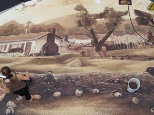 Gemeinsam wird ein 3m auf 7m großer, auf dem Boden liegender „Prospekt“ bemalt. Die Teilnehmer*innen bauen auf eine Vorzeichnung der Künstlerin auf und wenden klassische Aufbautechniken der Theatermalerei an. Jugendliche sind besonders willkommen.